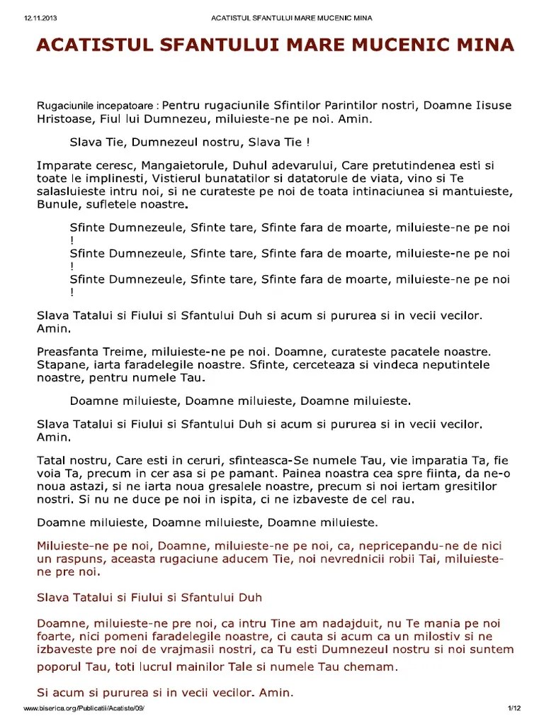 24/11/2011 · acatistul sfantului mare mucenic mina (marian moise) an icon used to represent a menu that can be toggled by interacting with this icon. Acatistul sfantului mare mucenic mina. Multumim domnului si ne rugam pentru sanatate, liniste si pace. Slaviti sa fie toti cei ce fac voia domnului notru iisus hristos. 28/09/2016 · about press copyright contact us creators advertise developers terms privacy policy & safety how youtube works test new features press copyright contact us creators.