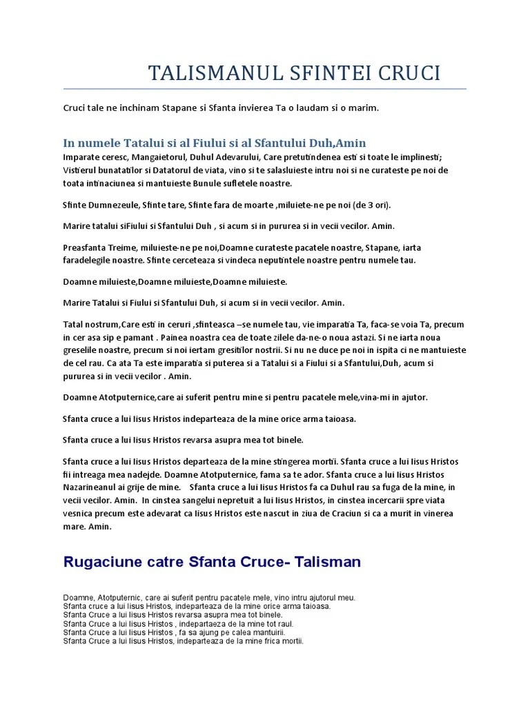 Sfântă cruce a lui iisus hristos, depărtează de la noi arma tăioasă.. Dumnezeu a trimis pe pamant aceasta scrisoare atat de puternica in fata dusmanilor si are puterea asa de mare si influenta pentru cel care o poarta si pentru cel care o aude citind, fiind valabilputerea ei 20 El nu va fi niciodata invins. Acela care va citi aceasta rugaciune, sau o va asculta, cand o va citi altcineva, sau o va purta asupra sa, acela nu are sa moara subit, nu va fi invins in lupta si nu va …. 29.10.2017 · talismanul (rugaciune facatoare de minuni) doamne atotputernic care ai suferit pentru toate pacatele mele, vino intru ajutor.