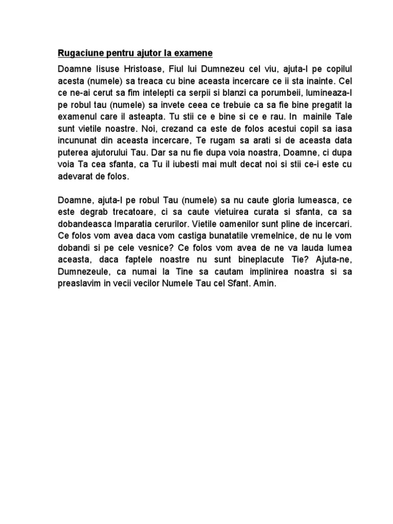 Știi momentele alea în care, deși ai învățat pentru examen, te blochezi și ai impresia că, de fapt, nu mai știi nimic? Dumnezeule preasfinte, izvor de nemărginită înțelepciune și. Ei bine, rugăciunea tocmai pentru este de ajutor! Împărate ceresc, mângâietorule, duhul adevărului, care pretutindenea ești și toate le plinești, vistierul bunătăților si dătătorule de viață, vino și te sălășluiește întru noi, și ne curățește pe noi de toată întinăciunea, și mântuiește, bunule, sufletele noastre. Rugaciune pentru examen pentru copii „doamne iisuse hristoase, fiul tatălui ceresc, care ai binecuvântat copiii şi ai zis: Rugăciunea părinților pentru ajutorul copilului la examen. Dumnezeule preasfinte, izvor de nemărginită înțelepciune și.