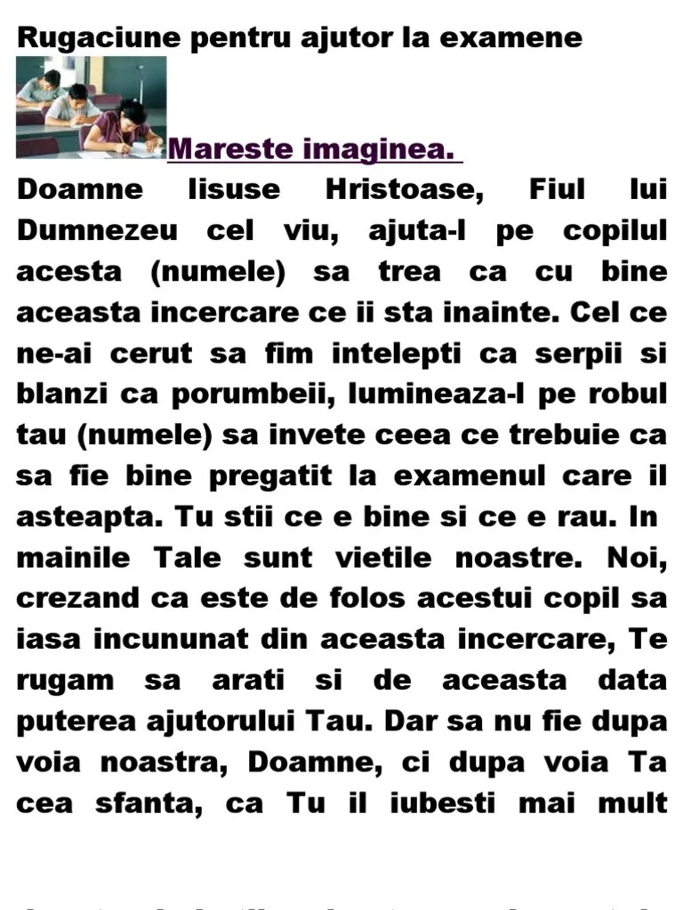 Ei bine, rugăciunea tocmai pentru este de ajutor!. Rugăciune, examen, rugăciune pentru ajutor la examen, rugaciune inainte de examen, maica domnului, studiu despre pr. Rugăciunea părinților pentru ajutorul copilului la examen. Dumnezeule preasfinte, izvor de nemărginită înțelepciune și. Când examenele se apropie, aveți nevoie de o rugăciune specială, adresată maicii domnului, pe care să o rostiți cu mare încredere, pentru că este grabnic ajutătoare. Ei bine, rugăciunea tocmai pentru este de ajutor! În același timp, copiii pot citi și paraclisul maicii domnului, care îi va scăpa de frica de examen și le. Știi momentele alea în care, deși ai învățat pentru examen, te blochezi și ai impresia că, de fapt, nu mai știi nimic? Rugaciune pentru examen pentru copii „doamne iisuse hristoase, fiul tatălui ceresc, care ai binecuvântat copiii şi ai zis: