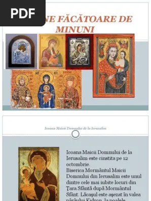 Iată câteva dintre icoanele făcătoare de minuni din românia:.. Lavra poceaev, un bastion vechi al ortodoxiei, adăpostește icoana făcătoare de minuni a maicii domnului de aproximativ 400 de ani. (referat despre o icoana facatoare de minuni), referat apasa butonul de download !!! Icoana făcătoare de minuni a maicii domnului cu pruncul, a fost donată mănăstirii dervent, în anul 1940, ,,de moştenitorii defunctului i. Am incercat sa prezint c. De asemenea, se crede că această icoană e o reproducere după originalul atribuit. Avand in vedere ca in urma... Am incercat sa prezint c.