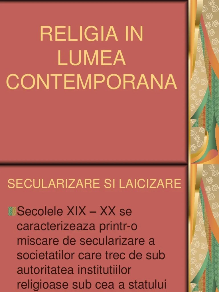 Subiectul religiei stârnește întotdeauna controverse și dezbateri ale lumii contemporane... Întemeierea republicii laice turcia de către mustafa kemal ataturk. Pe scurt, acestea sunt principiile călăuzitoare. Capitolul vii:religia în lumea contemporană. Aceasta îi conferă omului o identitate şi îi promite o viaţă după moarte mai bună... În rusia are loc instalarea regimului comunist, care propagă ateismul.